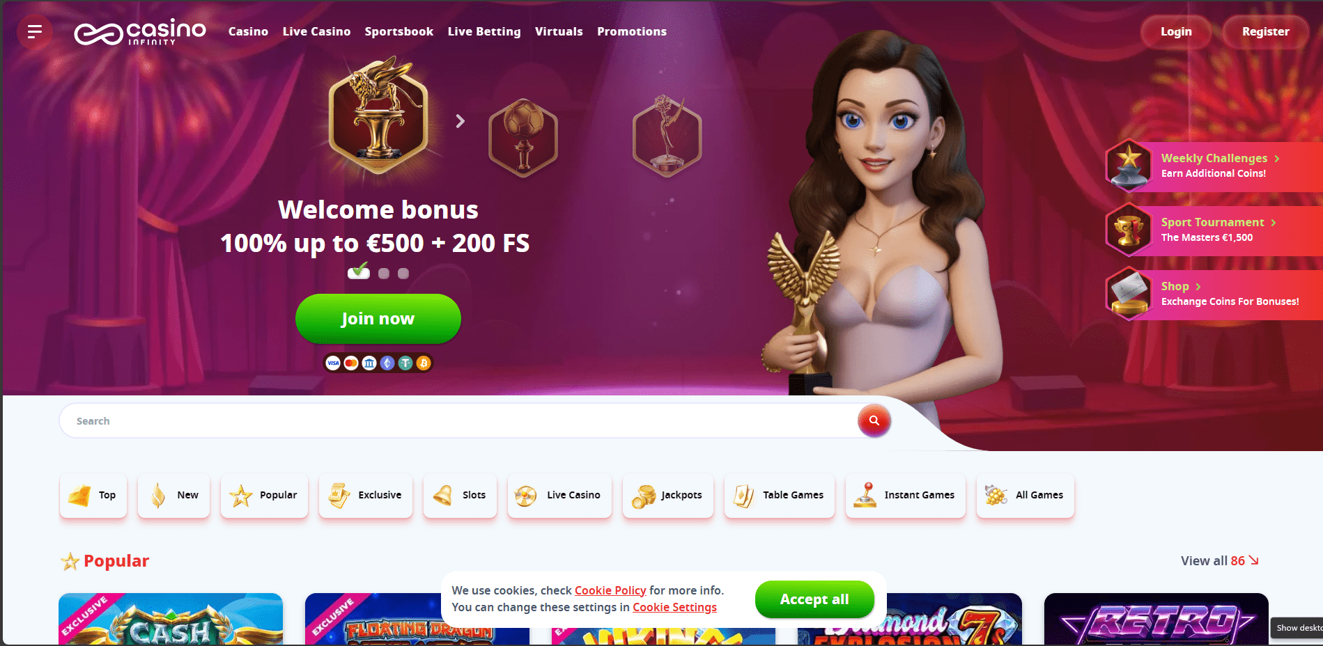 Rabidi N.V., an organization with extensive experience in the iGaming industry, is the owner and operator of Casino Infinity, which was founded in 2023. The sister sites of Casino Infinity are PowBet Casino, Boomerang Casino, and Vinyl Casino, among others. In terms of safety, there should be no worries because Casino Infinity is authorized by Curacaoan law and follows its rules. A pleasant welcome present for recently joined players is a 100% Welcome Deposit Bonus up to $500 + 200 Free Spins.