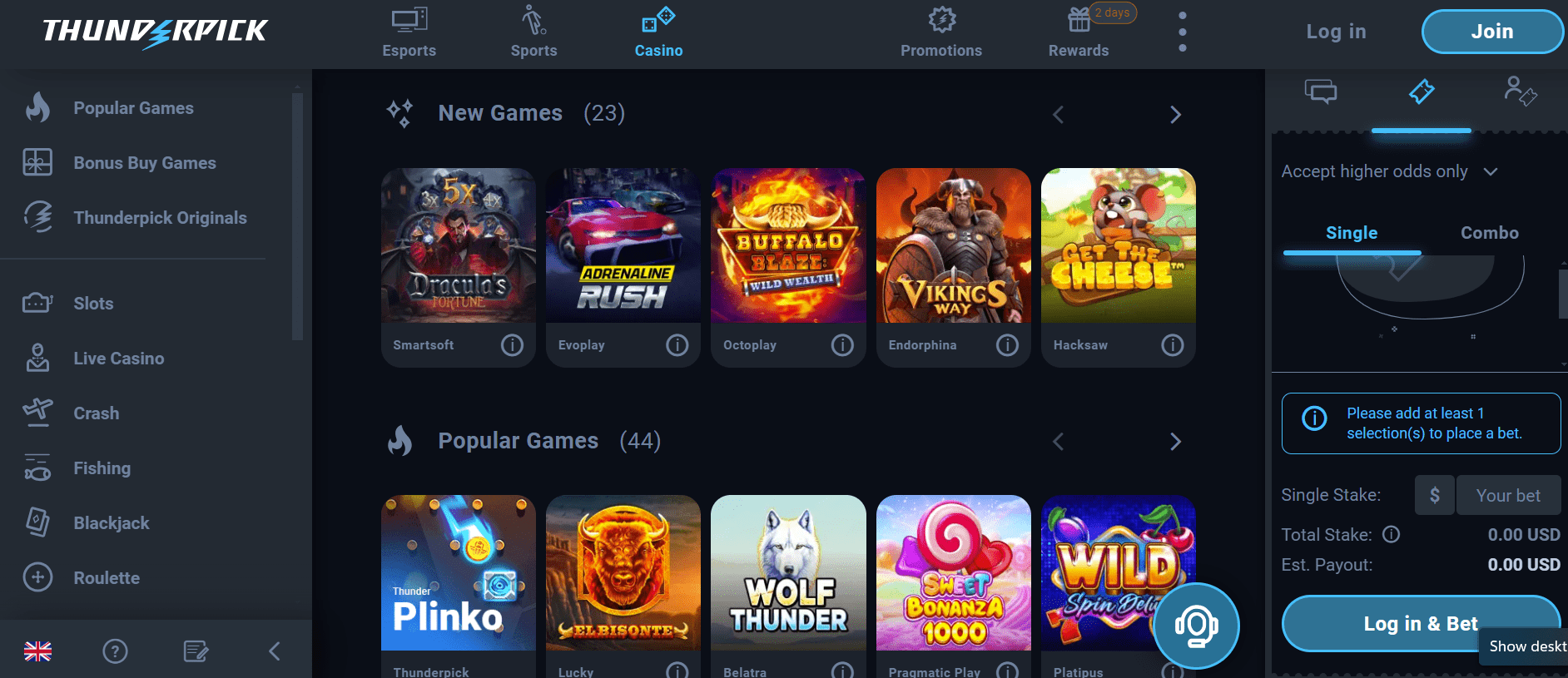 All guests at Thunderpick Casino have access to video slots, traditional table games, and, of course, live dealers. You can be confident that these games will meet your expectations because they are created by some of the most respected companies in the casino gaming sector. In the sportsbook section, you can also wager on the teams and players of your choice.