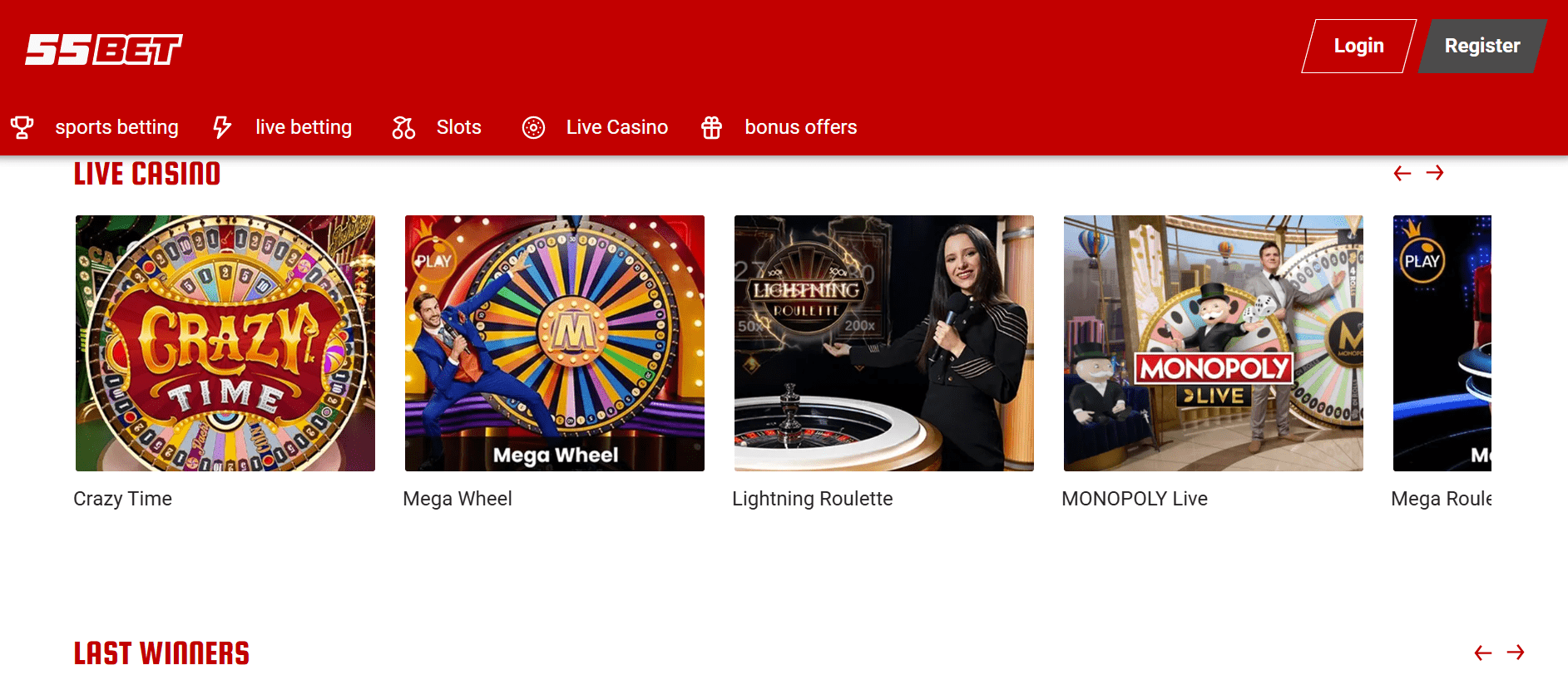 Das 55Bet Casino verfügt über ein umfangreiches Angebot von fast 5.000 Spielen, darunter Spielautomaten, Tischspiele, Live-Casinospiele, Jackpot-Spielautomaten und Sportwetten.