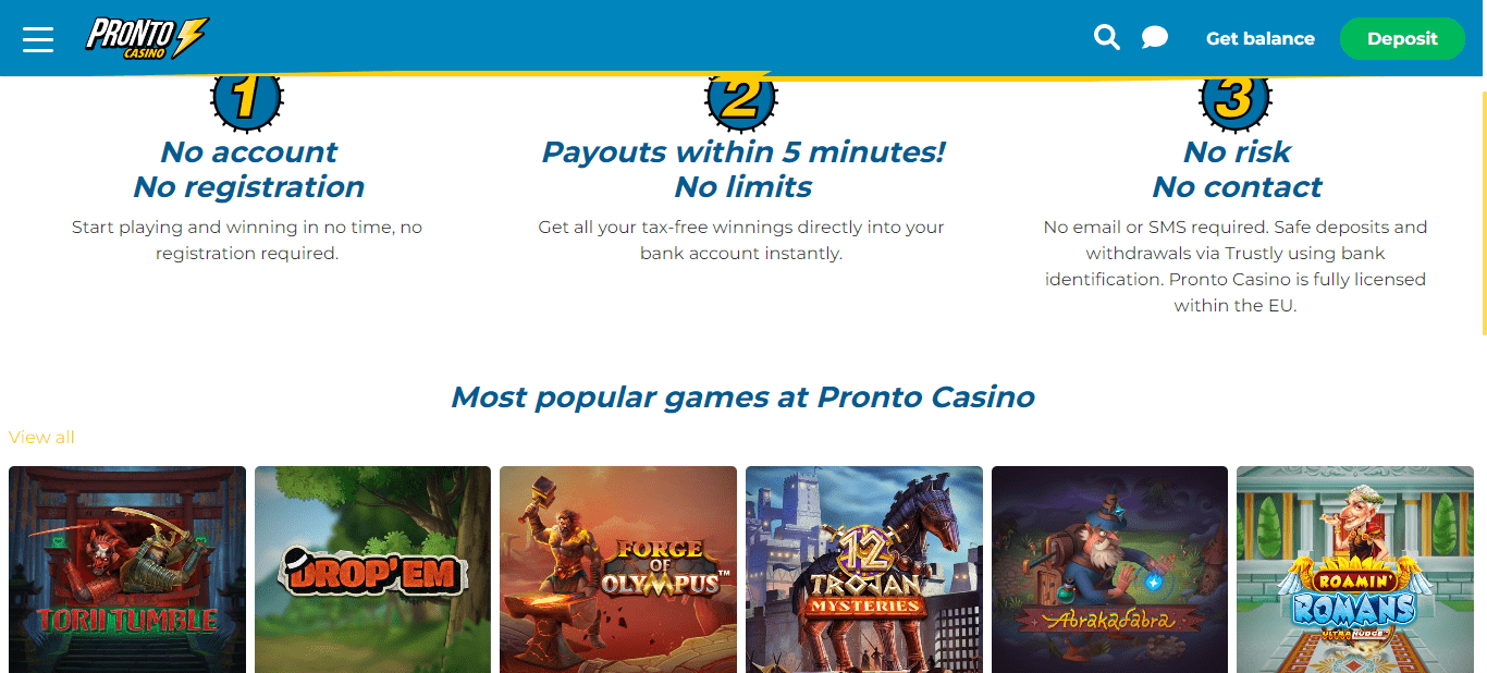 Prontocasino.com ei vaadi rekisteröitymistä. Napsauta vain kotisivun talletuspainiketta ja suorita onnistunut talletus aloittaaksesi pelaamisen. Suorapeli voi käyttää rahat heti. Nostoa varten sinun tarvitsee vain lähettää pyyntö, joka käsitellään automaattisesti, ja sinun pitäisi yleensä nähdä rahat pankkitililläsi viiden minuutin kuluessa.